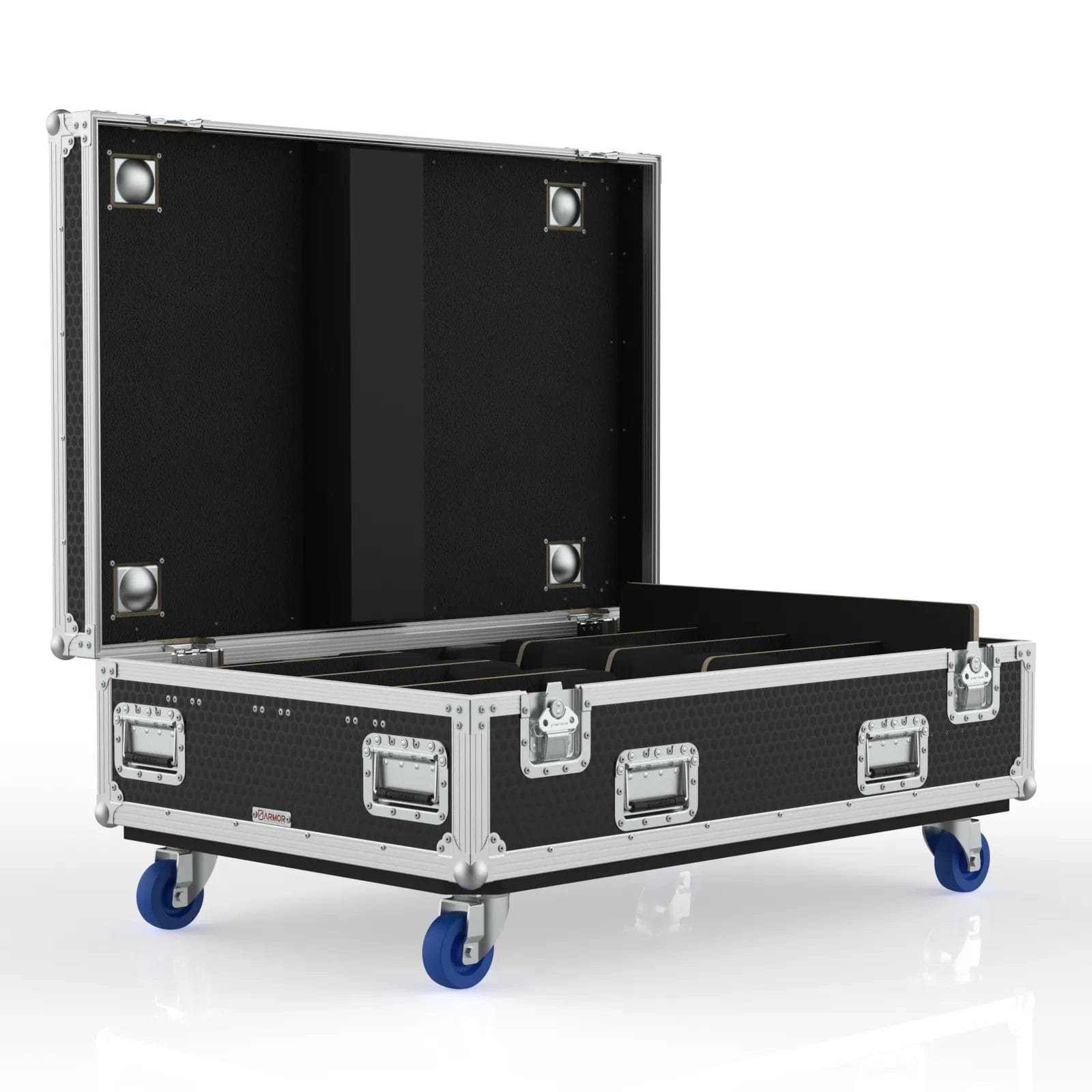 This road case holds four LED battens securely with foam padding and a dedicated accessory area. Its low‑profile design and hinged lid make it ideal for fast touring setups.